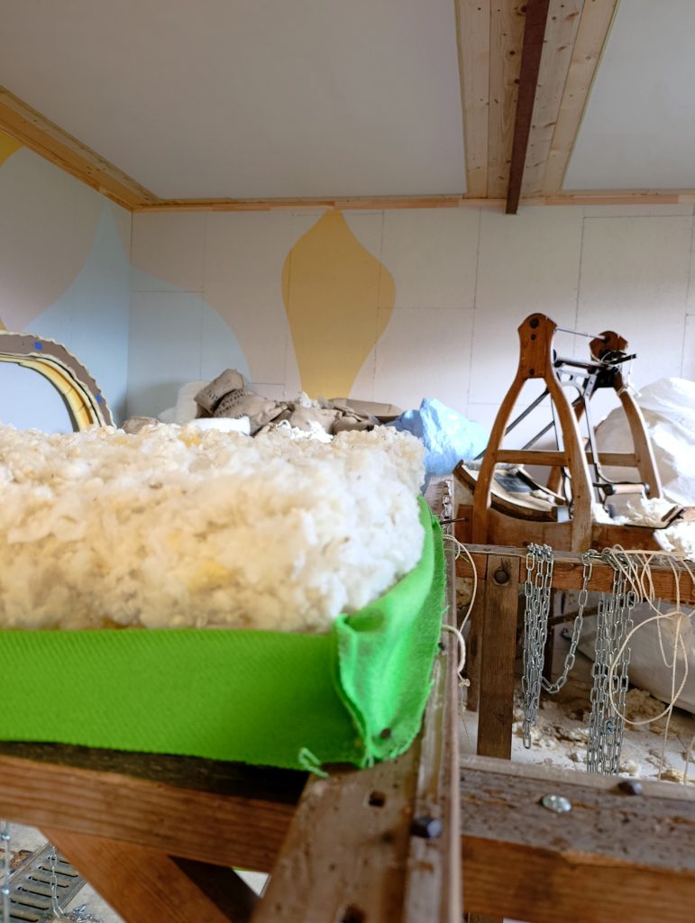 Les matelas sont fabriqués à la main avec de la laine de mouton soigneusement choisie: elle provient d’un élevage à 40 km de l’atelier en Saône et Loire. Elle est réceptionnée à l’atelier, triée, lavée par fermentation, mise à sécher et entreposée pour un usage ultérieur. C’est une laine de bonne qualité, avec un bon ressort pour apporter un confort optimal. La qualité de la laine est primordiale pour une plus longue durée. Plus elle est nerveuse, plus le matelas sera confortable.